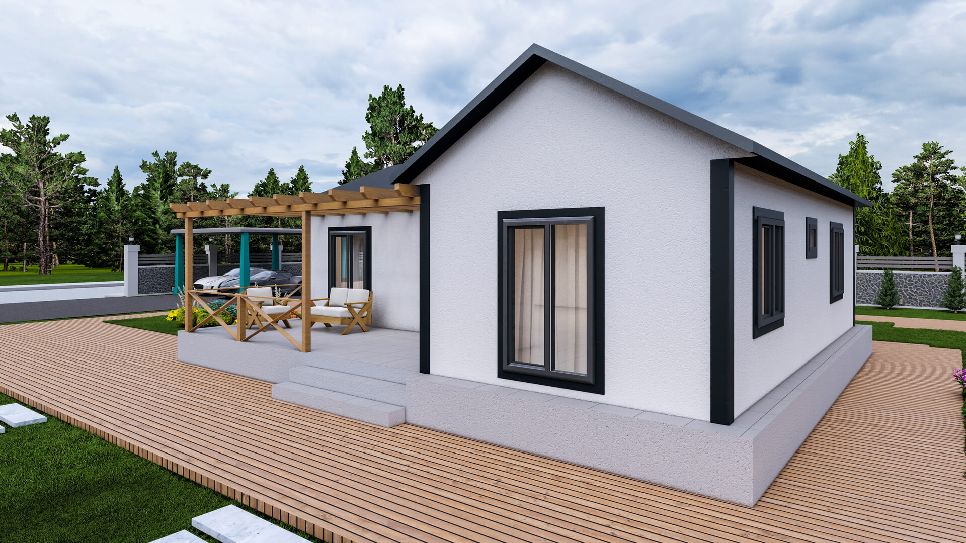 Modelin dış görünümü, beyaz cephe kaplaması ile koyu çerçevelerin uyumunu bir araya getirir. Giriş bölümünde yer alan geniş ahşap pergolalı veranda, hem eve sıcak bir karakter kazandırır hem de açık havada keyifli zaman geçirebileceğiniz bir yaşam alanı oluşturur. Doğal ışığı bolca içeri alan geniş pencereler, evin içini her zaman ferah ve aydınlık tutar.