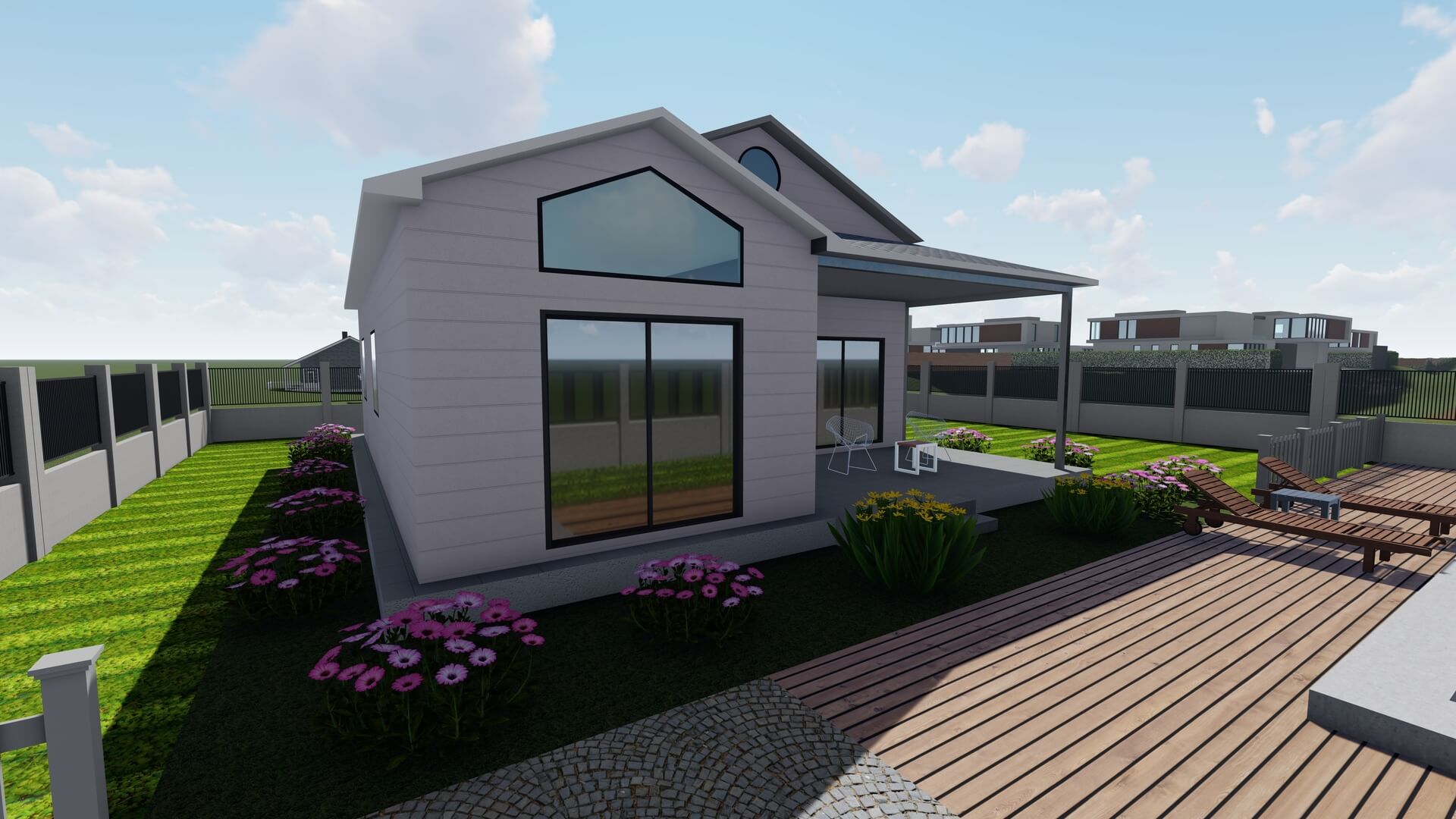 RC-1097’nin dış cephesi, çağdaş çizgileri ön plana çıkaran geniş cam açıklıkları, simetrik çatı yapısı ve ferah bir veranda alanıyla tamamlanmıştır. Geniş sürgülü kapılar ve büyük pencereler, doğal ışığın iç mekâna maksimum seviyede ulaşmasını sağlar.