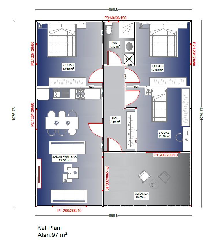 • Hol (7.50 m²): Ev içerisinde akıcı ve konforlu geçiş sağlayan merkezi dağılım alanıdır.