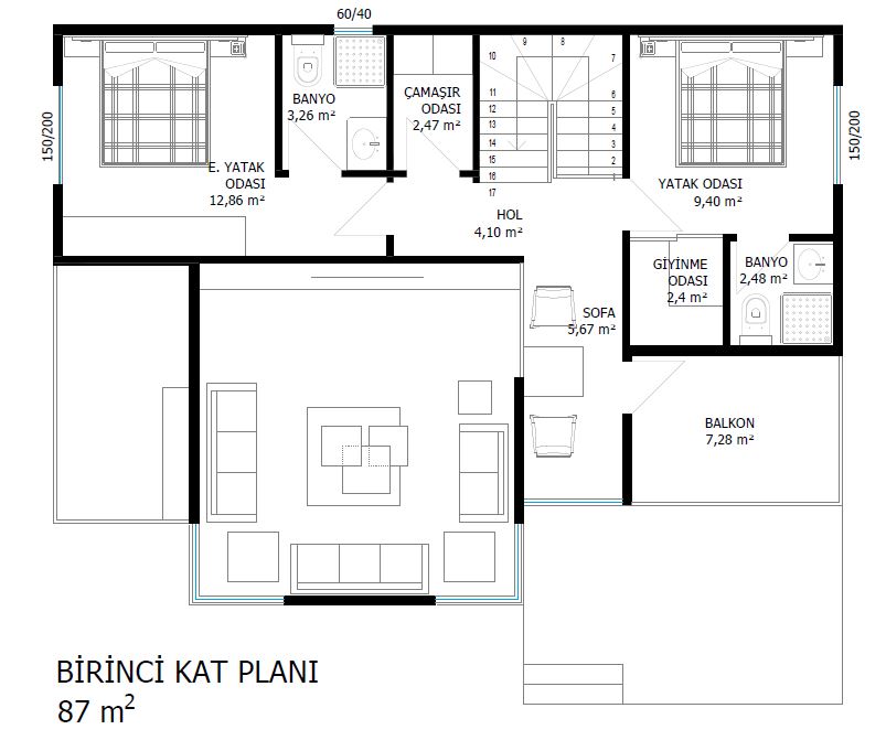 Birinci katta iki adet yatak odası, iki banyo, giyinme odası, çamaşır odası ve merkezi bir oturma alanı bulunur. Bu kat tamamen özel yaşam için tasarlanmıştır. 12 m² ve 9 m²’lik odalar hem çocuk hem ebeveyn kullanımı için ideal ölçülerdedir. Merkezdeki oturma bölümü aile içi sosyal alan oluşturur ve aynı zamanda dinlenme köşesi olarak işlev görür. Geniş balkon ise günün her saati keyifli dış mekân deneyimi sunar.