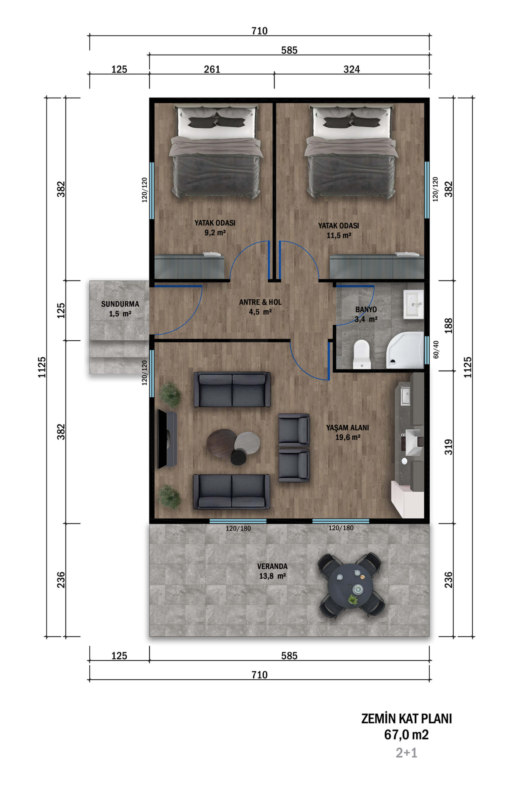 Modelin geniş veranda alanı, sosyal yaşamı dış mekâna taşıyarak kullanıcılarına yılın her döneminde keyifli anlar yaşatır. Enerji verimli yalıtım sistemi ile hem ekonomik hem de sürdürülebilir bir yaşam alanı sağlar.