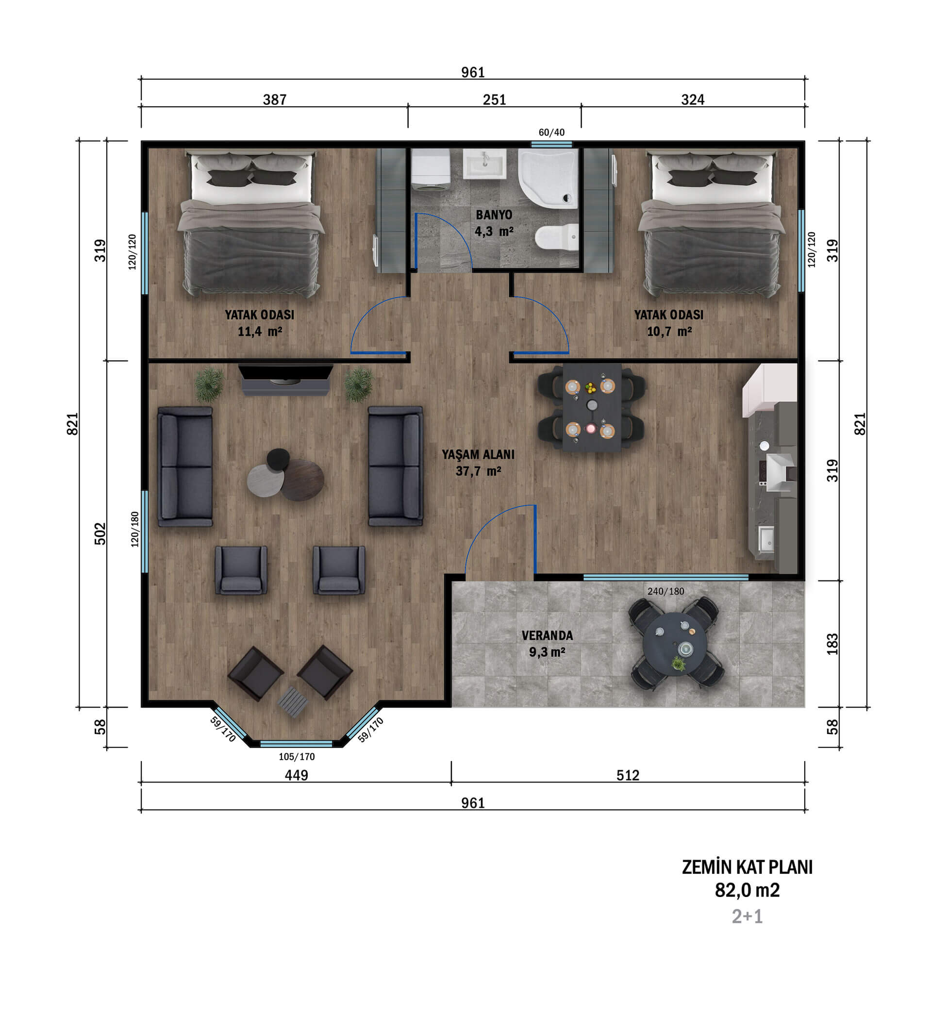 Yaşam alanının 37.7 m² gibi oldukça geniş bir ölçüye sahip olması, bu modeli rakiplerinden ayıran en belirgin özelliklerden biridir. Salon ve mutfağın aynı çatı altında akıcı bir şekilde birleştirilmesi, günlük yaşamı kolaylaştırırken daha sosyal bir alan yaratır. Evin iki ayrı yatak odası ise farklı ihtiyaçlara göre planlanmış; biri 11.4 m², diğeri 10.7 m² olarak tasarlanmıştır. Bu sayede hem ebeveynler hem de çocuklar veya misafirler için konforlu özel alanlar sağlanır. 4.3 m²’lik banyo ise kompakt yapısına rağmen depolama ve kullanım açısından işlevsel bir planlamaya sahiptir.