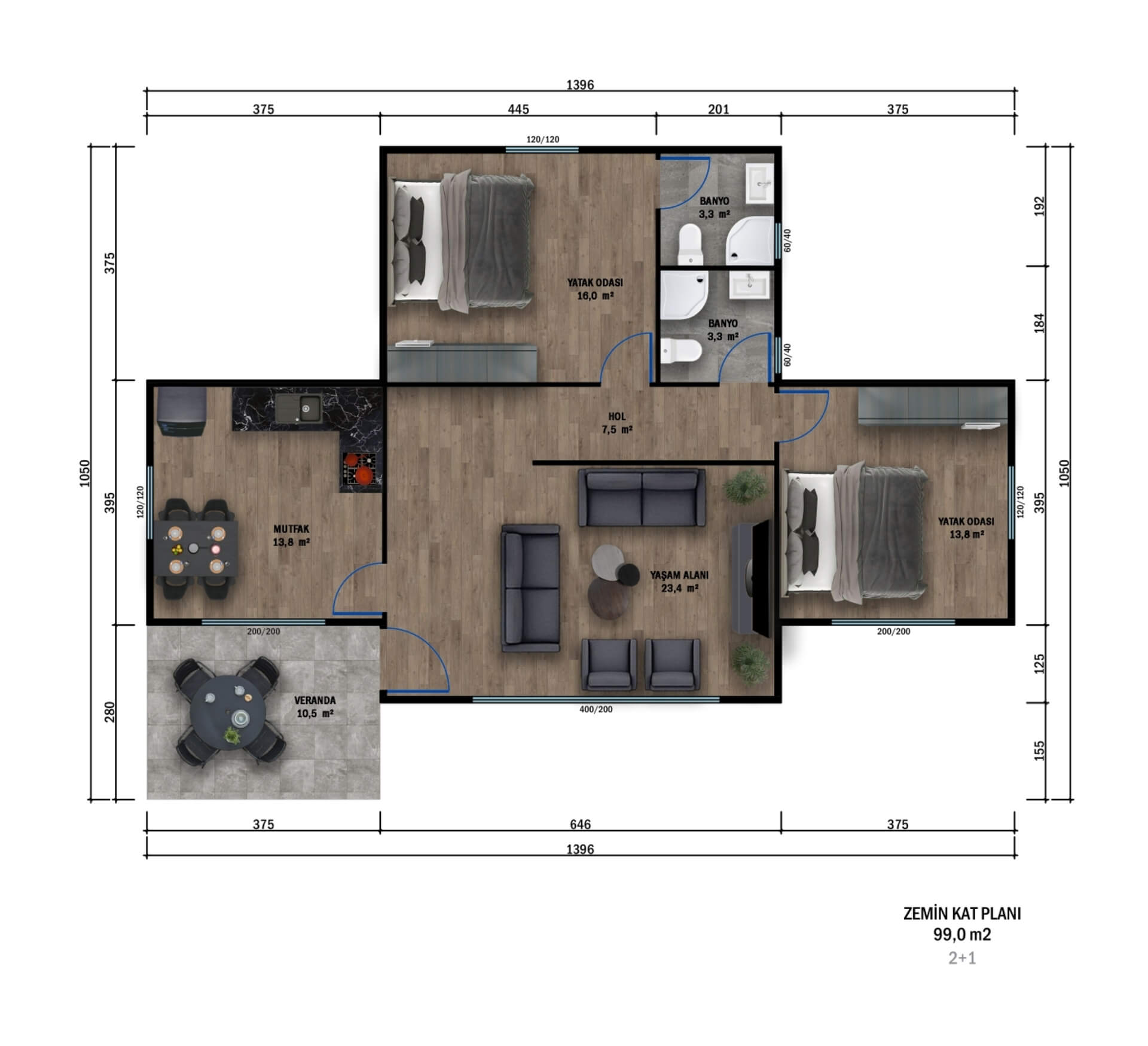 Mutfak 13,8 m²’lik kullanım alanıyla standart bir prefabrik evden çok daha geniştir. Veranda ile bağlantılı olması, yaz aylarında açık havada yemek deneyimini kolaylaştırır. Tüm odalarda doğru ölçülendirilmiş yerleşim sayesinde hem depolama hem yaşam fonksiyonları verimli şekilde sağlanır.